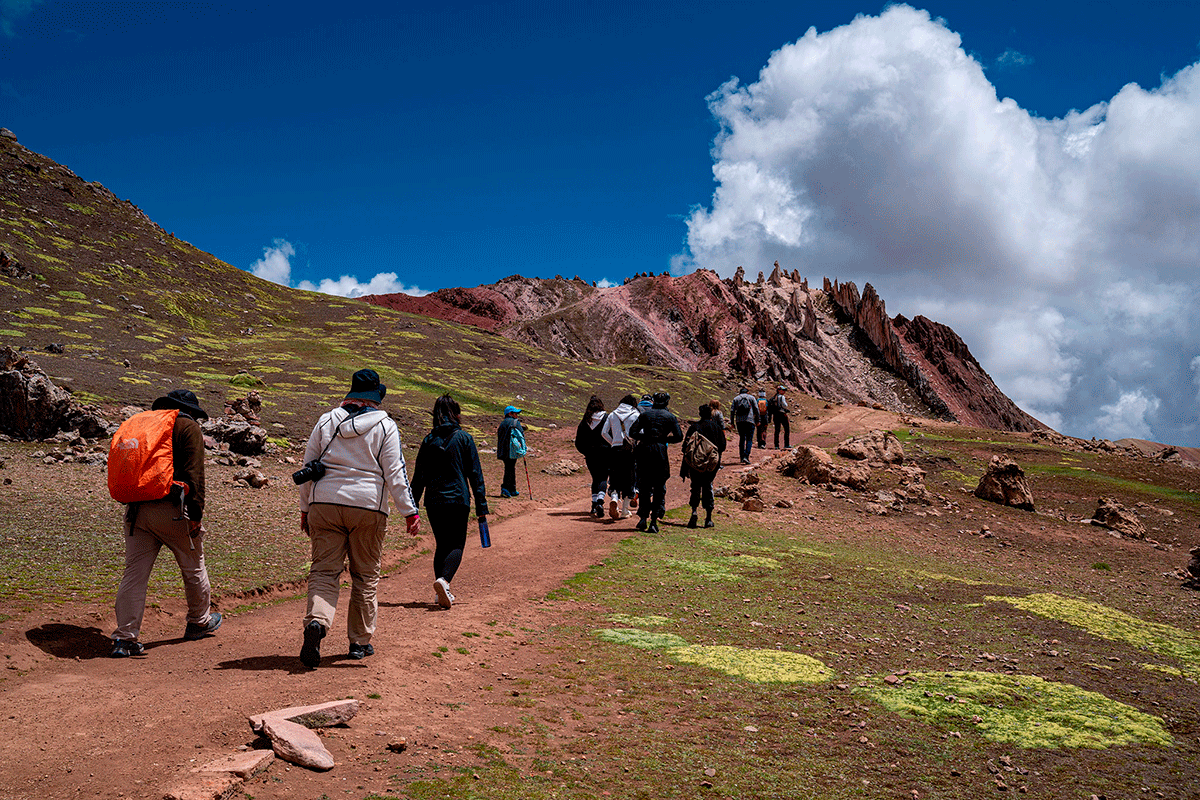 El tour comienza temprano, con el recojo de los hoteles/hostales céntricos de Cusco entre las 04:00 y las 04:40 am. Luego nos dirigiremos al pueblo de Cusipata, donde disfrutaremos de un desayuno nutritivo. A continuación, continuaremos nuestro viaje hasta el punto más cercano a la montaña del «Arco Iris o Siete Colores». Una vez que lleguemos al punto de inicio de nuestro trekking, el guía dará información del lugar e instrucciones del trekking para finalmente iniciar la caminata cuesta arriba por una hora y media a dos horas hasta llegar al mirador de la Montaña de los 7 Colores. Si lo prefieres, también tienes la opción de ir en caballo por un costo adicional. Una vez que lleguemos al mirador, ubicado a una altitud de 5,030 msnm, dispondremos de tiempo libre para disfrutar de una impresionante vista de la montaña, con colores que van desde el verde, amarillo, morado y rojo, así como otras variaciones de estos colores. También tendremos la oportunidad de apreciar el nevado más alto y sagrado de la región de Cusco, el Apu Ausangate (6,380 msnm), que forma parte de la Cordillera Real de los Andes. En el camino, podremos observar alpacas y llamas. Después de disfrutar del hermoso paisaje de colores, descenderemos durante una hora hasta llegar al estacionamiento de los autobuses, desde donde regresaremos a la ciudad de Cusco. Sin embargo, haremos una parada en el pueblo de Cusipata para disfrutar de nuestro almuerzo y posteriormente continuaremos el viaje de regreso a Cusco.
