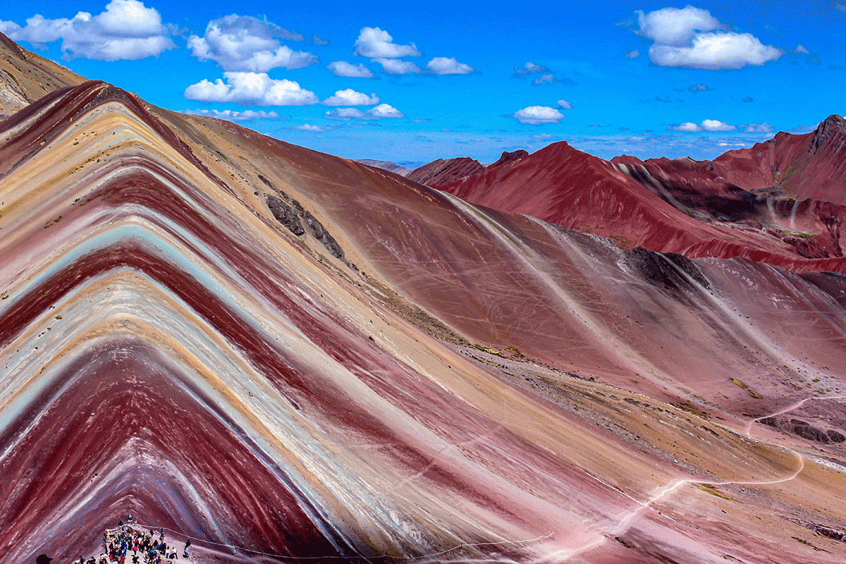 El tour comienza temprano, con el recojo de los hoteles/hostales céntricos de Cusco entre las 04:00 y las 04:40 am. Luego nos dirigiremos al pueblo de Cusipata, donde disfrutaremos de un desayuno nutritivo. A continuación, continuaremos nuestro viaje hasta el punto más cercano a la montaña del «Arco Iris o Siete Colores». Una vez que lleguemos al punto de inicio de nuestro trekking, el guía dará información del lugar e instrucciones del trekking para finalmente iniciar la caminata cuesta arriba por una hora y media a dos horas hasta llegar al mirador de la Montaña de los 7 Colores. Si lo prefieres, también tienes la opción de ir en caballo por un costo adicional. Una vez que lleguemos al mirador, ubicado a una altitud de 5,030 msnm, dispondremos de tiempo libre para disfrutar de una impresionante vista de la montaña, con colores que van desde el verde, amarillo, morado y rojo, así como otras variaciones de estos colores. También tendremos la oportunidad de apreciar el nevado más alto y sagrado de la región de Cusco, el Apu Ausangate (6,380 msnm), que forma parte de la Cordillera Real de los Andes. En el camino, podremos observar alpacas y llamas. Después de disfrutar del hermoso paisaje de colores, descenderemos durante una hora hasta llegar al estacionamiento de los autobuses, desde donde regresaremos a la ciudad de Cusco. Sin embargo, haremos una parada en el pueblo de Cusipata para disfrutar de nuestro almuerzo y posteriormente continuaremos el viaje de regreso a Cusco.