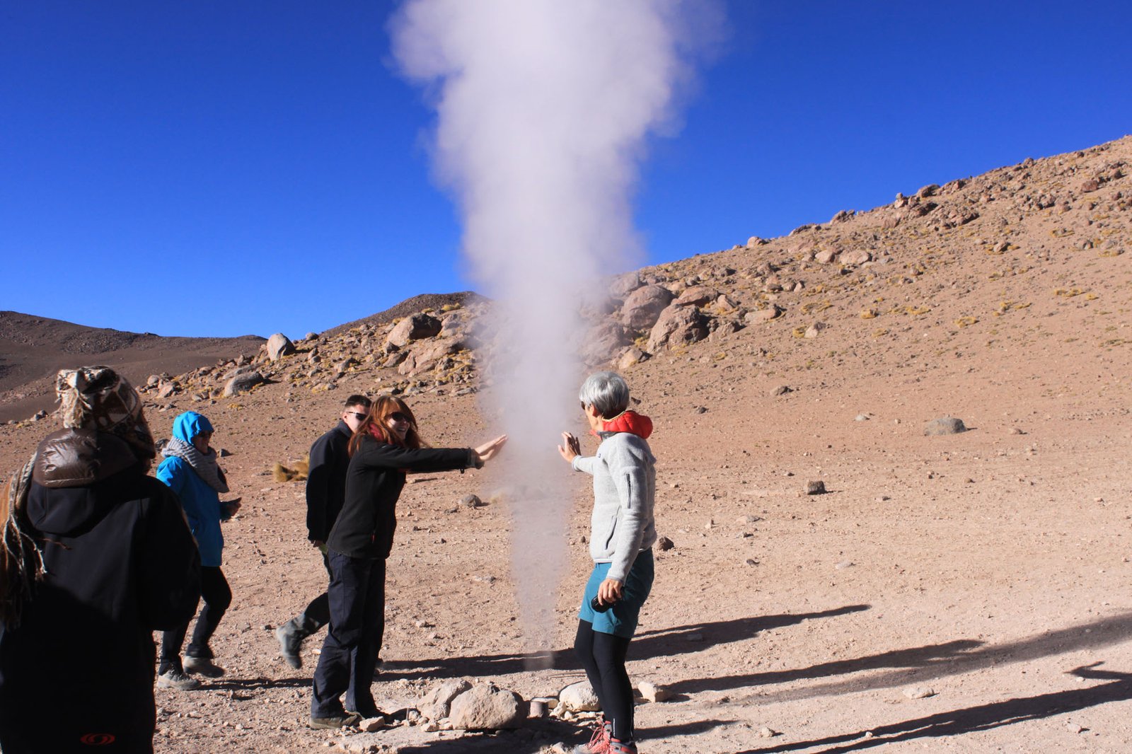 Este día saldremos muy temprano a nuestro tour (05:00 am). Para poder apreciar los Géiseres conocidos como «Sol de Mañana» fumarolas en la zona volcánica y fuentes geotérmicas. También hay pozas de agua caliente y barro burbujeante, creando un paisaje casi lunar. Luego continuaremos hasta los baños termales de Polques de Chalviri, que se encuentran a una altitud de alrededor de 4,300 msnm. Después de esta parada, continuaremos nuestro recorrido hacia el Desierto de Salvador Dalí, un lugar donde el arte está plasmado en la misma naturaleza. Se le denomina así porque es similar a algunos paisajes pintados por el pintor español Salvador Dalí, aunque él nunca estuvo en este lugar. Posteriormente, nos dirigiremos hasta las Lagunas «Blanca y Verde», ubicadas a los pies del volcán Licancabur, a una altura de 4,350 msnm. El color verde esmeralda se debe al alto contenido de magnesio, calcio y sodio en el agua. Desde la Laguna Verde tendremos una hermosa vista del volcán Licancabur, que es el hito natural que indica la frontera entre Bolivia y Chile, y tiene una altura de 5,920 msnm. Luego de haber visitado la laguna Verde continuaremos el viaje a la frontera de Hito Cajones (Bolivia – Chile), allí realizaremos trámites migratorios y cambio de transporte para continuar el viaje hasta San Pedro de Atacama, y estaremos llegando a próximamente a horas 13:00 hrs.