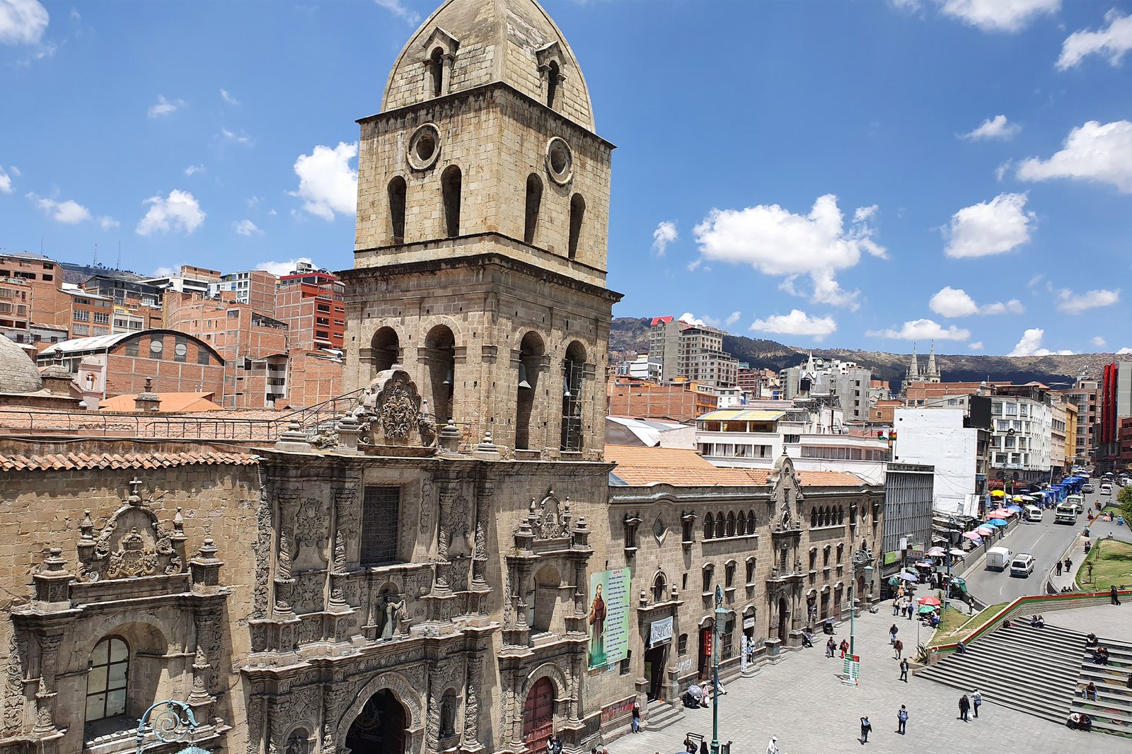 Tarde: 13:30pm. Recojo del hotel para tener la visita a la ciudad maravilla, visitaremos la calle Jaén, una de las calles más coloniales y pintorescas de la ciudad, posteriormente visitaremos la plaza Murillo el corazón político de Bolivia, apreciaremos La Catedral Metropolitana, el Palacio de Gobierno y Legislativo, también visitaremos la plaza mayor de San Francisco junto a su iglesia; después ascenderemos por una de las calles más empinadas y turísticas, la calle Sagarnaga, rodeada de coloridas artesanías, hasta llegar al mercado de las brujas un lugar místico, allí podremos ver desde las ofrendas a la Pachamama (Madre tierra), hasta encontrarnos con un colorido cielo de paraguas como detenidos en el aire, dando la impresión de que casi las podemos sostener, allí tendremos tiempo libre para que se tomen fotografías muy interesantes, después continuaremos el recorrido para dirigirnos al Valle de la Luna al sur de la ciudad, es un atractivo natural ya que con el transcurso de los siglos y la erosión ayudaron a crear caprichosas formaciones de conos y cráteres que se asemejan a un verdadero y casi «real» paisaje lunar, tendrán tiempo libre para que puedan tomarse fotografías con diferentes perspectivas posteriormente nos dirigiremos hacia la estación de salida de los teleféricos para recorrer una parte de la ciudad por el aire en la red de teleféricos más alta del mundo; desde las cabinas de las líneas Verde, Amarilla, Plateada y Morada, se logrará tener una diferente perspectiva de la ciudad donde podremos observar los impresionantes nevados que son parte de la Cordillera Real y así usted podrá dejarse envolver por el encanto de la naturaleza de una ciudad moderna, cultural y a la vez tradicional en La Paz.