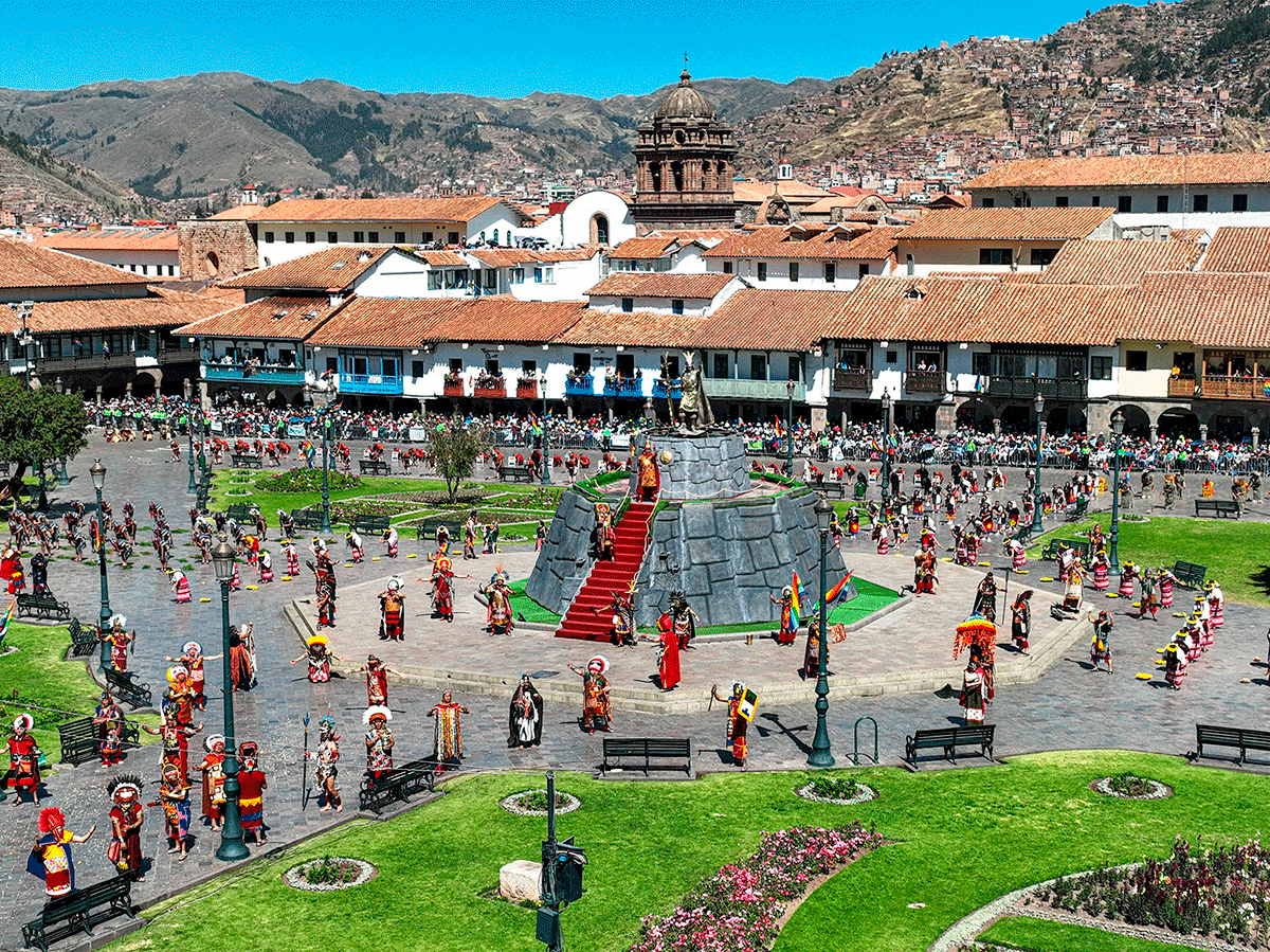 La Ceremonia en Plaza de Armas (Antes llamada Plaza Huacaypata): La ceremonia continúa con la entrada del Inca y su sequito a la plaza principal de la ciudad, donde continúan rindiendo homenaje al dios Sol, acompañados de las autoridades gubernamentales y el pueblo en general.