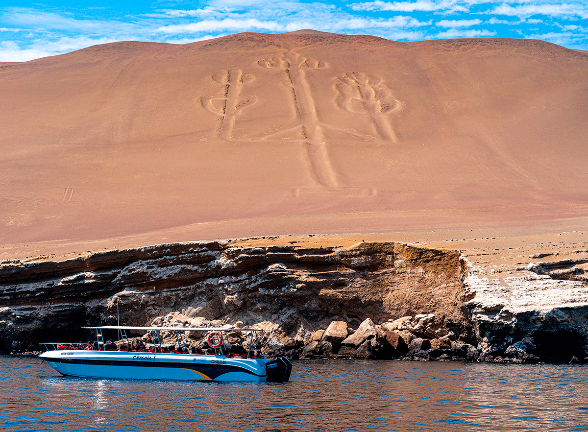 Abordaremos nuestra embarcación con 2 motores fuera de borda que nos llevará a las maravillosas Islas Ballestas. Durante nuestra travesía, tendremos la oportunidad de observar el «Candelabro», una figura gigante grabada en la arena. Luego, continuaremos el viaje hacia las islas donde podremos apreciar formaciones rocosas, mientras el guía explica sobre la flora y fauna en la zona.